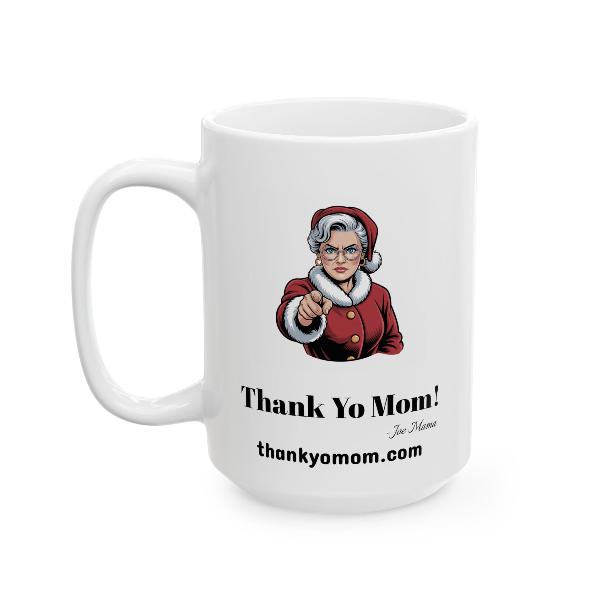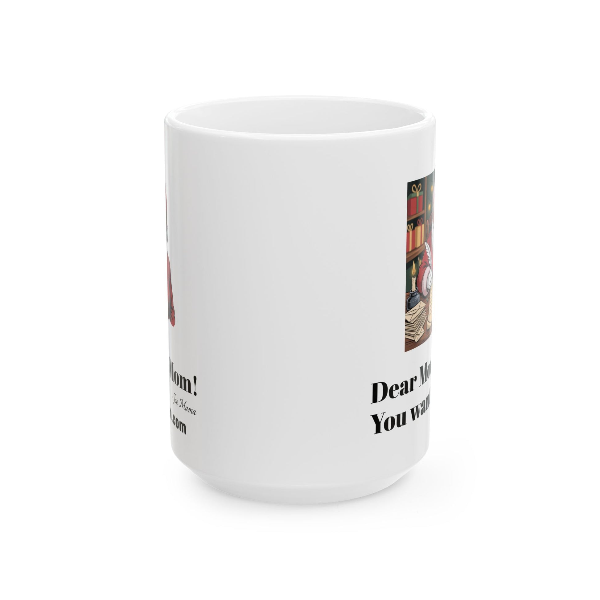 A humorous and playful ceramic mug featuring Santa Claus threatening his mother with presents and Mrs. Claus setting him straight. This mug is perfect for Christmas enthusiasts looking to add a touch of humor to their holiday decor. It makes a great gift for family and friends during the festive season.