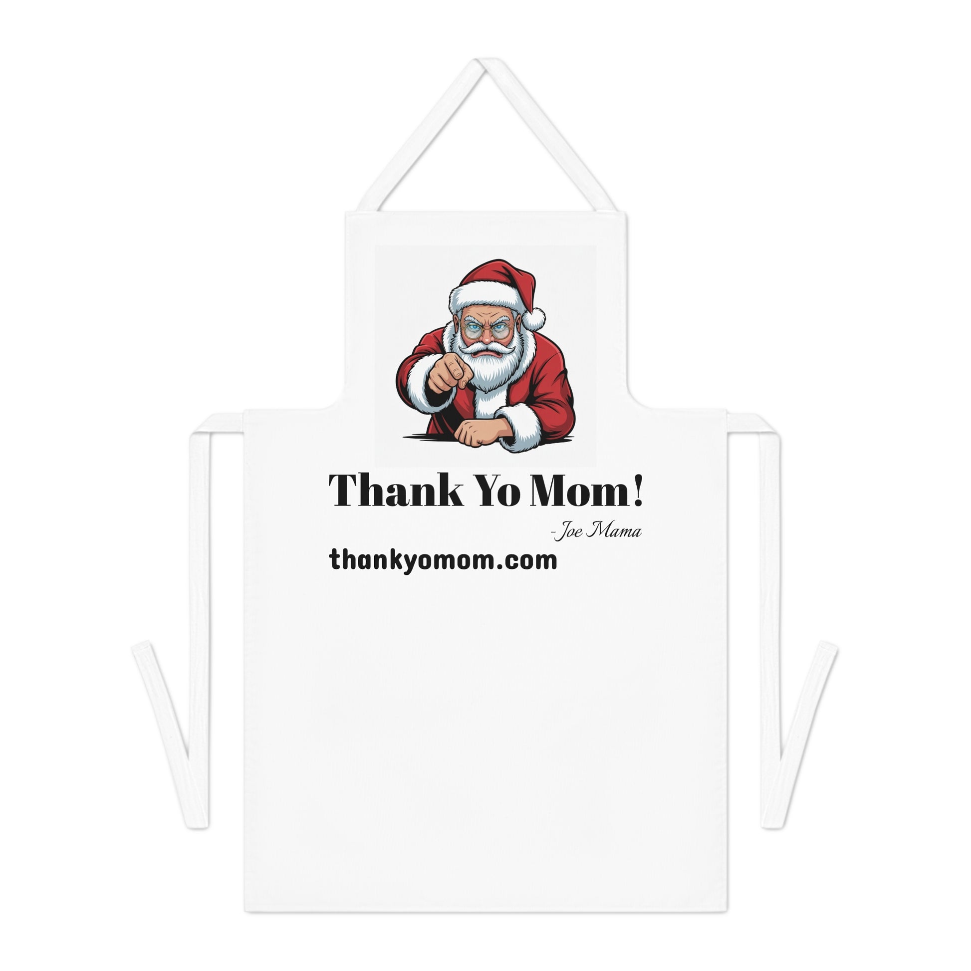 A festive adult apron designed with the message 'Who is cooking Christmas Dinner Thank Yo Mom'. Perfect for the holiday season, this lightweight apron with tie back closure is made of 100% cotton, making it comfortable to wear while cooking. Ideal for adults looking to add some holiday spirit to their kitchen attire.
